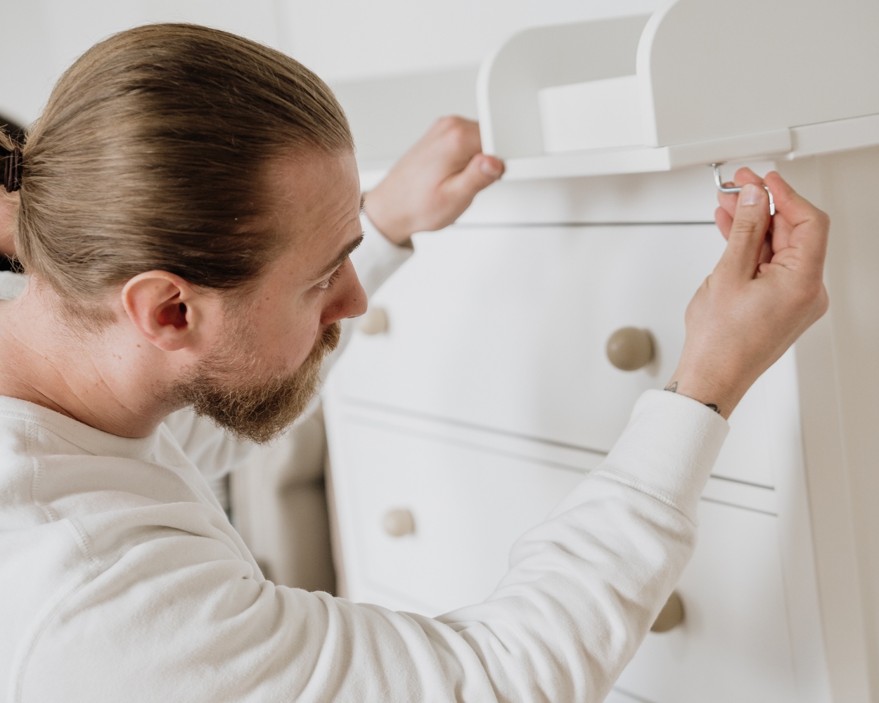 Wenn du den Aufsatz zusammengebaut hast, kannst du die Kommode nun ca. 15 cm nach vorne ziehen, sodass zwischen Kommode und Wand eine Lücke entsteht. Jetzt kannst du den Wickelaufsatz auf die Kommode aufsetzen.