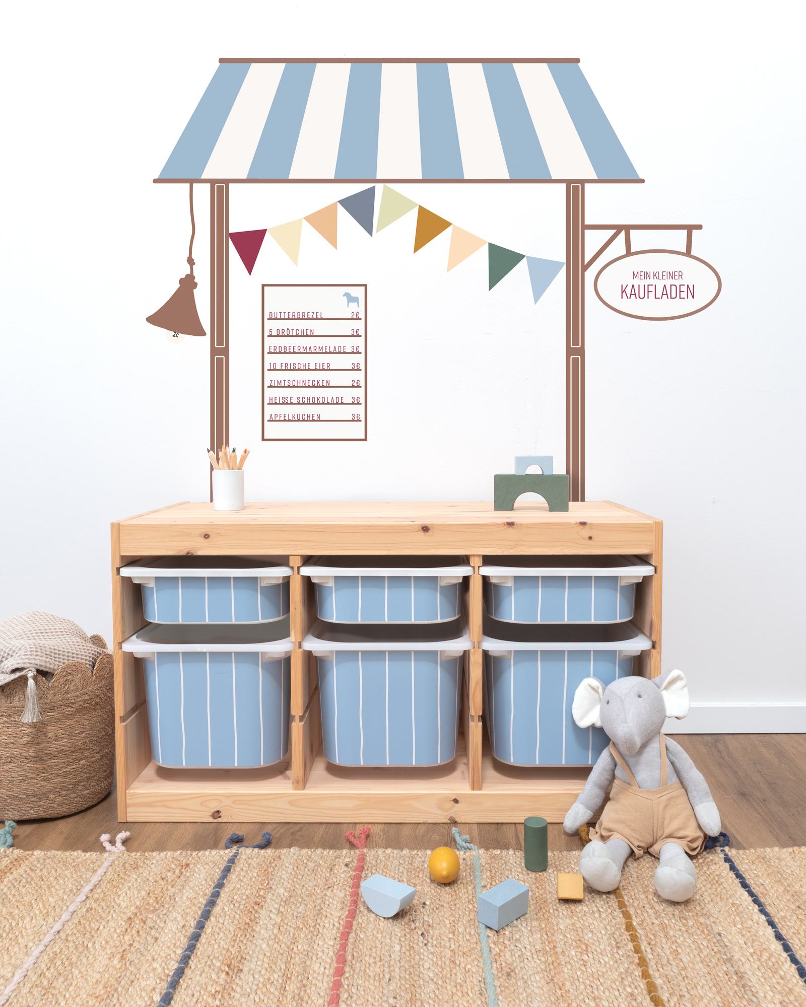 Hinweis: Unsere Klebefolien für die kleinen IKEA TROFAST Boxen (30 × 42 cm) passen auch auf die längere Seite der Mini TROFAST Boxen (20 × 30 cm). So kannst du auch dein IKEA TROFAST Hängeregal individuell gestalten und verschönern!